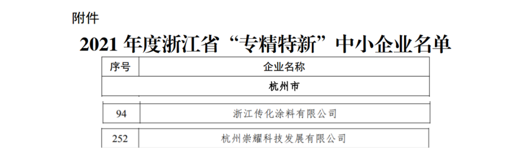 為深入貫徹黨中央國務院和省委省政府關(guān)于培育專精特新企業(yè)的決策部署,加快構(gòu)建“五企”培育體系,近日,浙江省經(jīng)濟和信息化廳公布了2021年度浙江省專精特新中小企業(yè)和隱形冠軍企業(yè)。傳化集團旗下浙江傳化涂料有限公司(以下簡稱傳化涂料)獲評2021年度浙江省隱形冠軍企業(yè)和2021年度浙江省“專精特新”中小企業(yè),杭州崇耀科技發(fā)展有限公司(以下簡稱崇耀科技)獲評2021年度浙江省“專精特新”中小企業(yè)。