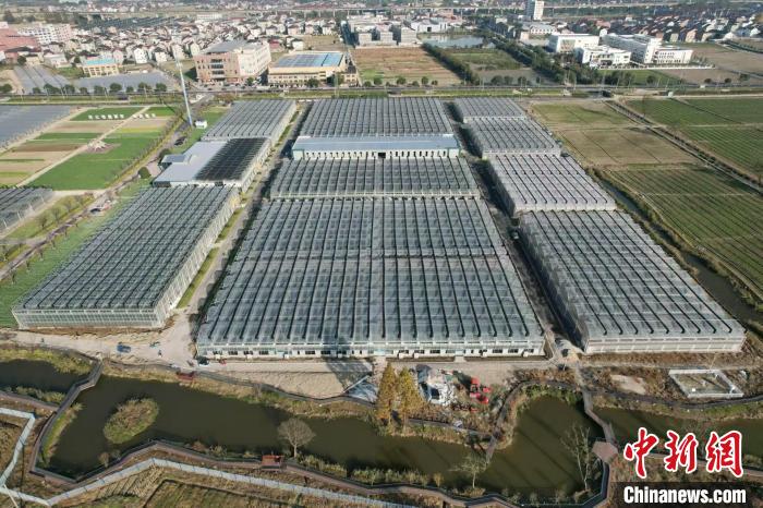 浙江杭州謝徑安·傳化農(nóng)創(chuàng)村溫室大棚。(無人機(jī)照片)   中新社記者 張祥毅 攝